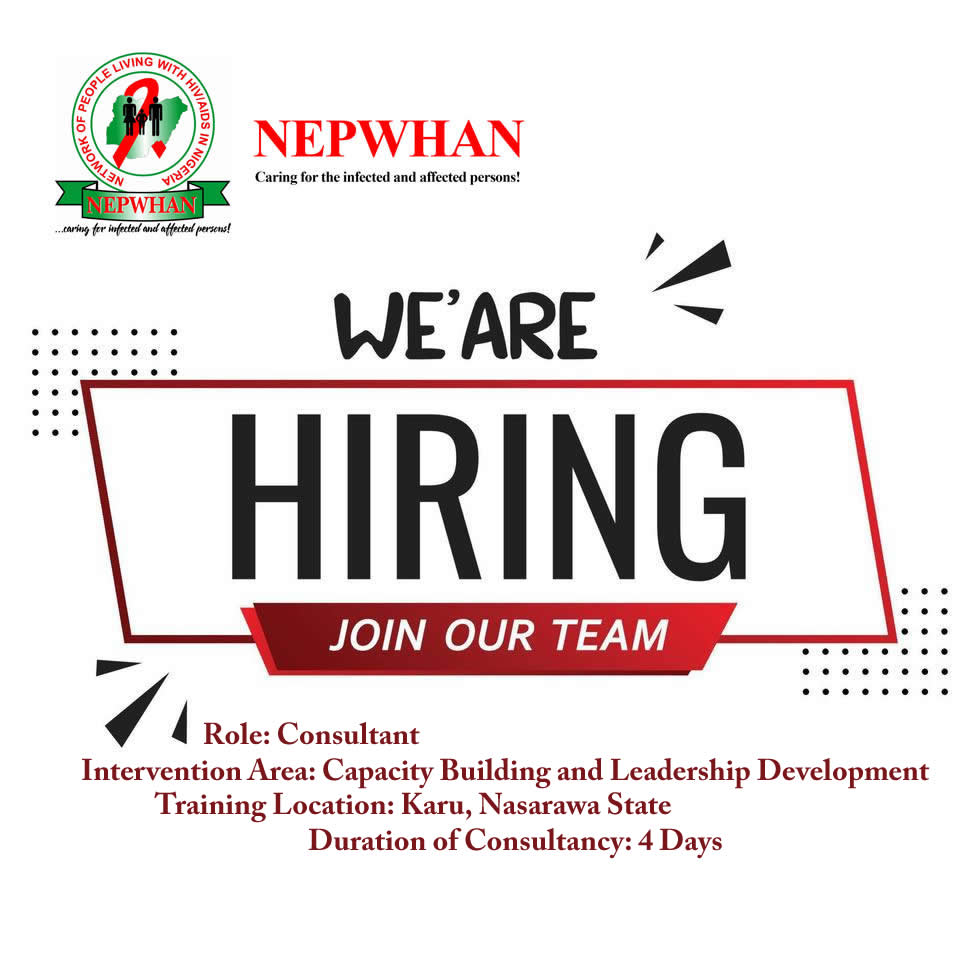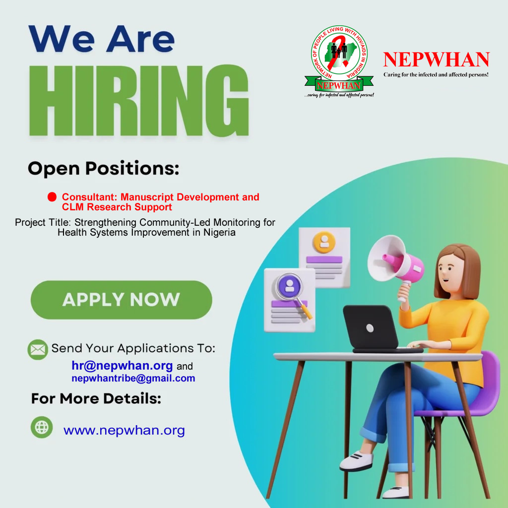 GLOBAL FUND CIRCLE 7(GC7) RESILIENT AND SUSTAINABLE SYSTEMS FOR HEALTH (RSSH)GRANT Advertised Roles: Lead Consultant and State Supervisors Context: Human Right and Gender Based Violence Intervention Area: Community Observatory in response to human rights and gender issues Coverage: Akwa Ibom, Bauchi, Oyo, Sokoto, Anambra, Plateau, Rivers, Lagos, Kaduna Gombe, Delta and Ogun. Supervision: NEPWHAN Planned implementation period:…